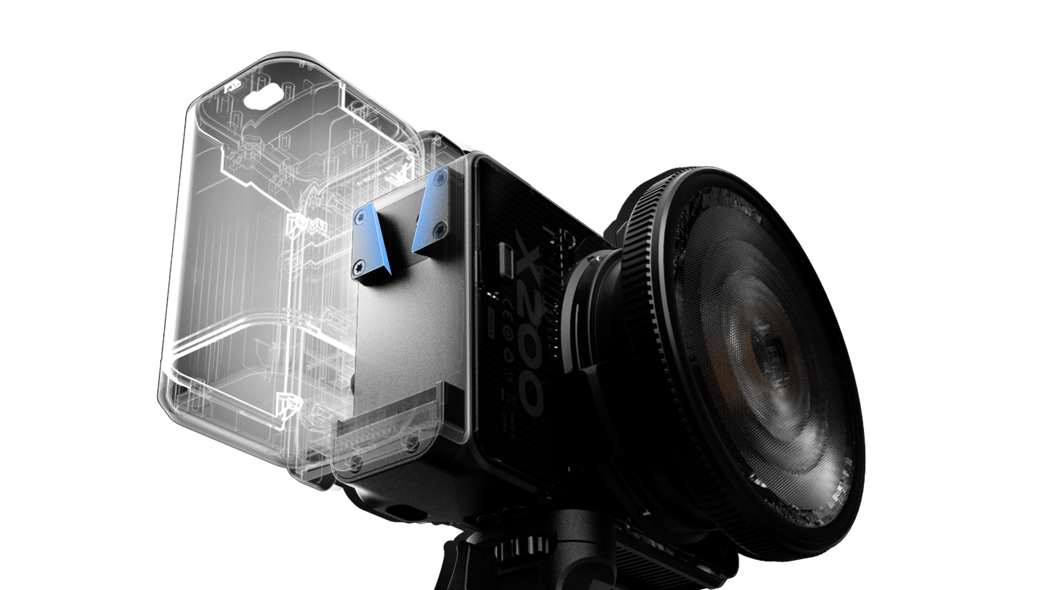 X200使用V口扣板设计,兼容业内通用V口电池,高度集成化,减少线缆缠绕,电池是手柄也是电源,供电不是累赘,是重新定义专业级灯光的使用体验。